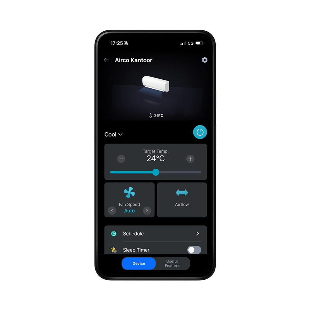 Dankzij de ingebouwde AI-functies leert de LG AI Air Mirror Black uw gebruikspatronen kennen en past hij automatisch de temperatuur, luchtstroom en modus aan. Het systeem houdt rekening met factoren zoals buitentemperatuur en bezetting van de ruimte, zodat u altijd een aangenaam binnenklimaat heeft zonder constant handmatig bij te regelen.